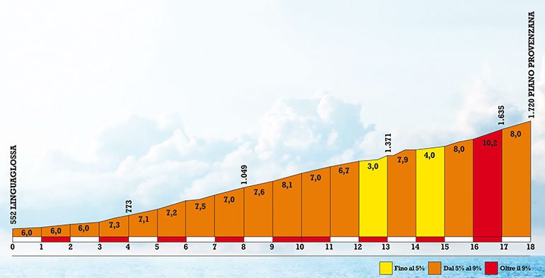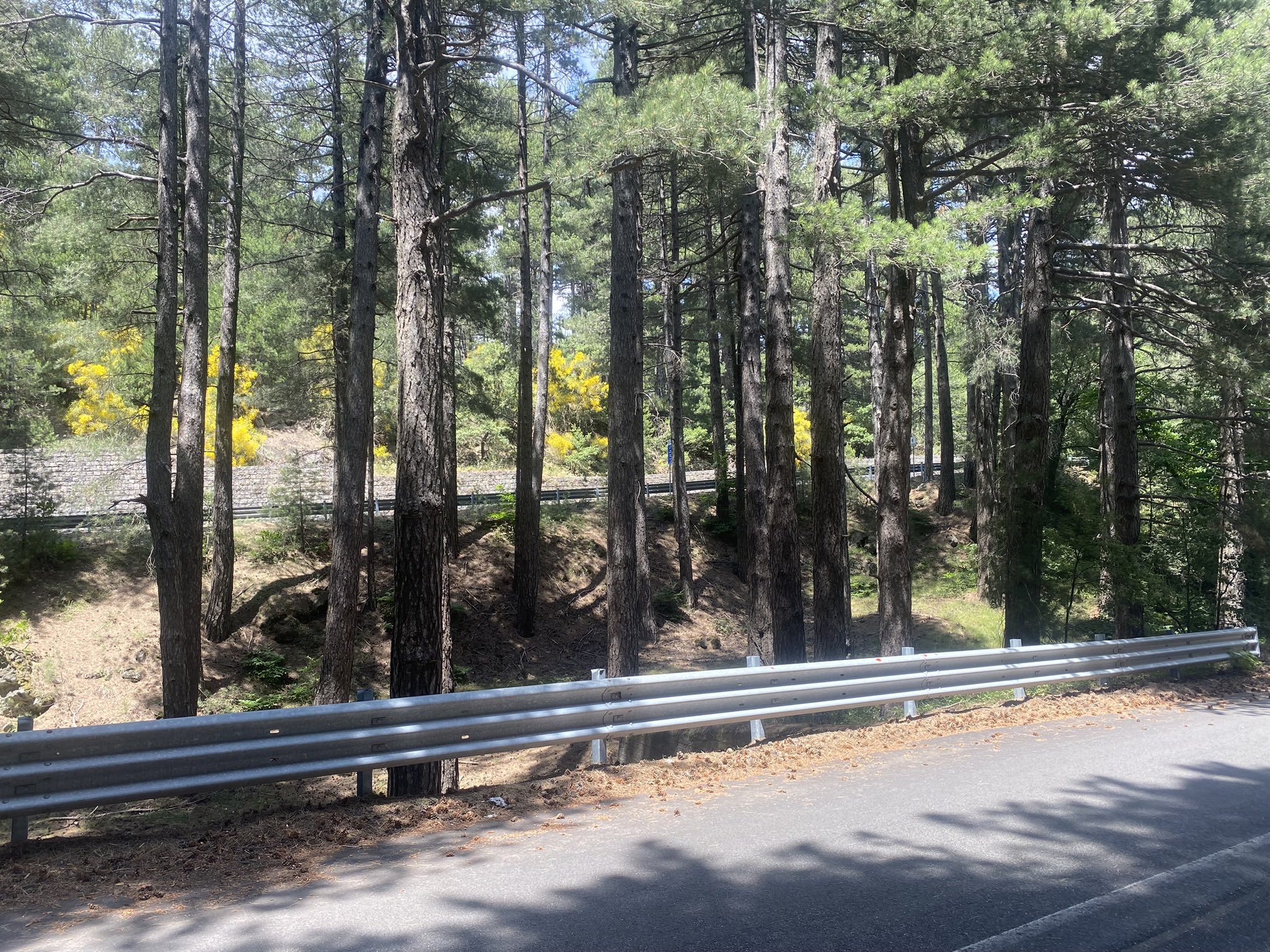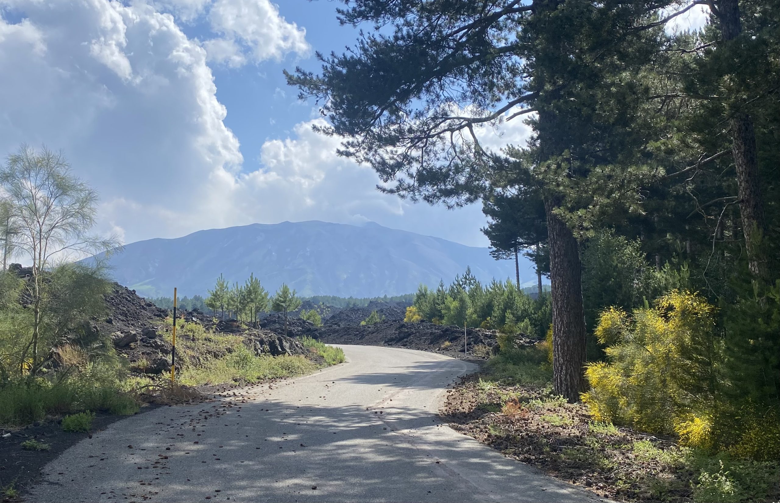 Ce matin, par précaution, je remplis mon bidon de 5 litres et le préserve de la chaleur en le calant au fond d’une sacoche. Ces 5 kg s’ajoutent notamment à l’équipement nécessaire à l’ascension d’un 3000m en été que je charge depuis le début de mon Tour de Sicile (chaussures de randonnée, coupe-vent, pantalon, vêtements thermiques légers, bonnet, gants et protège-cou au cas où). Paré, je me lance dans la longue ligne droite montante qui sort de Linguaglossa et qui va heureusement et rapidement commencer à serpenter sous les ombrageux pins mélèzes de la Pinède de Linguaglossa.