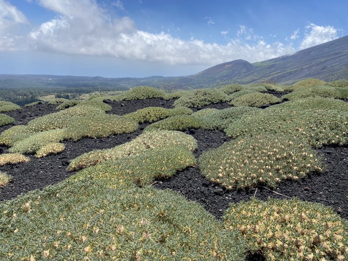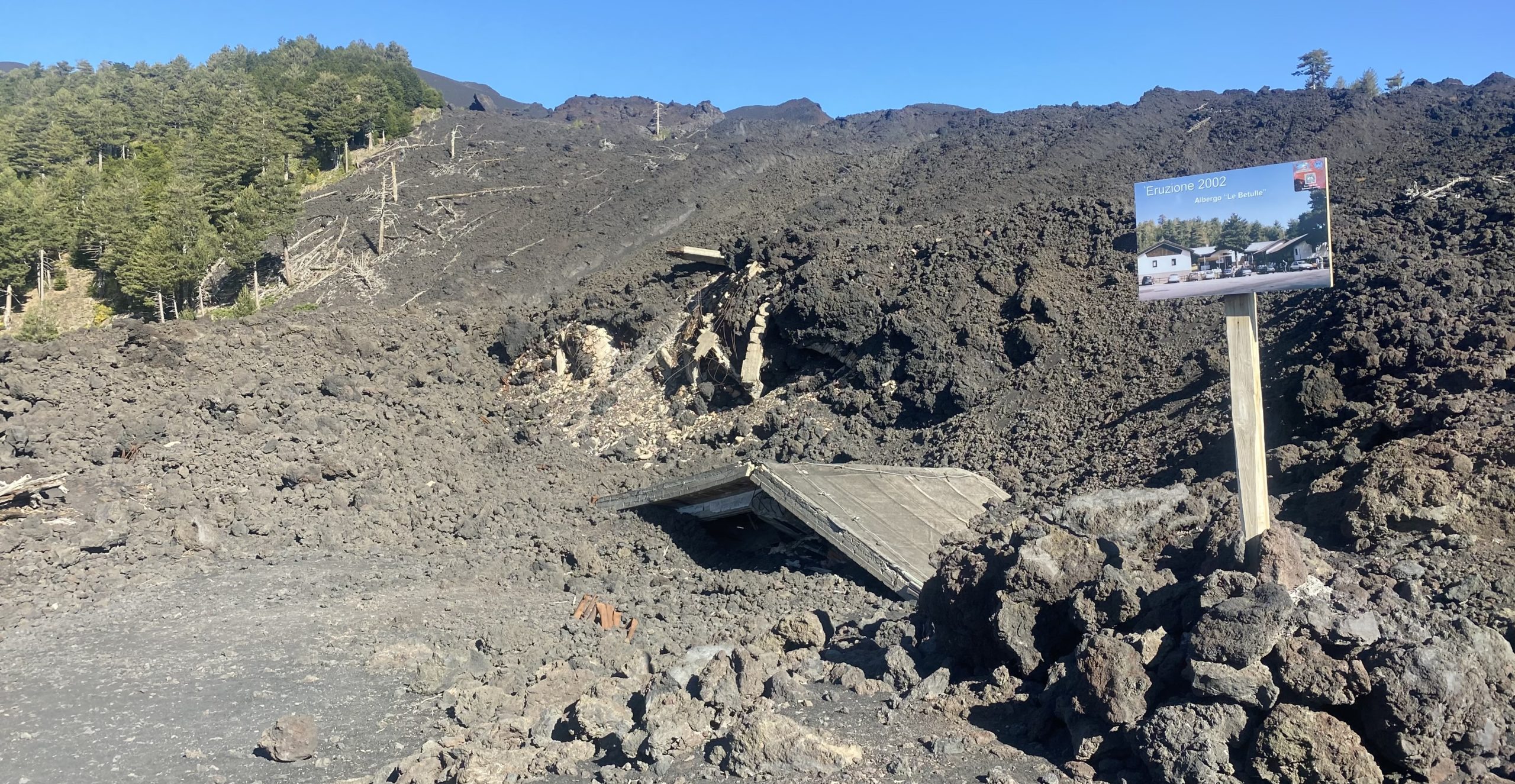 Car ensuite, au terme de 18 km et 1250m de dénivelé, la base touristique Piano Provenzana est totalement à découvert et livrée aux éléments. Aux rayons du Soleil d’une part, au vent qui commence à souffler et, lors de l’éruption de 2002, à la lave qui recouvrira et détruira totalement l’ancien complexe.
